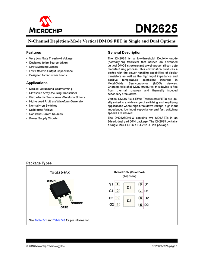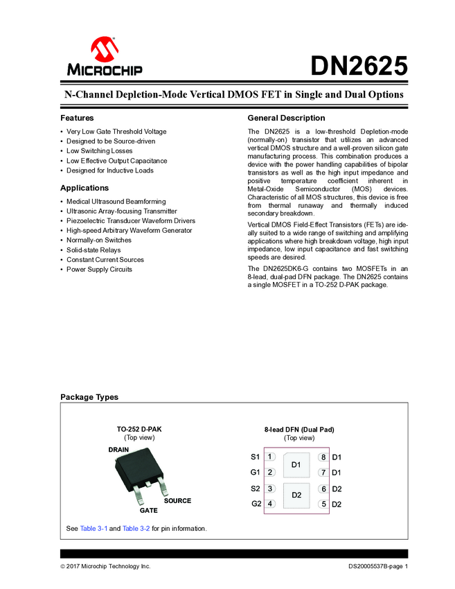 DN2625 - N-ch Depletion-Mode Vertical DMOS FET in Single and Dual Options (06/27/2014)