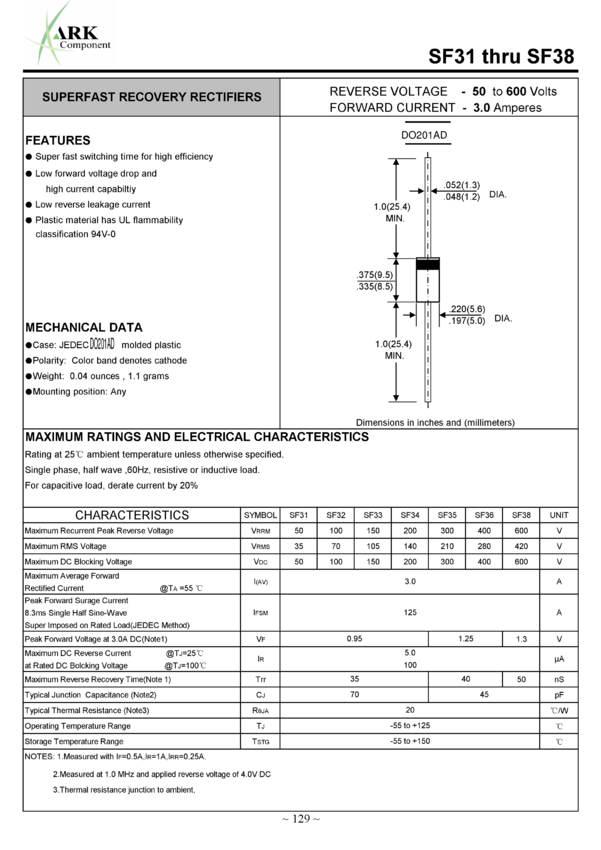 Dioda 3A, 200V, 35ns, DO201AD ARK