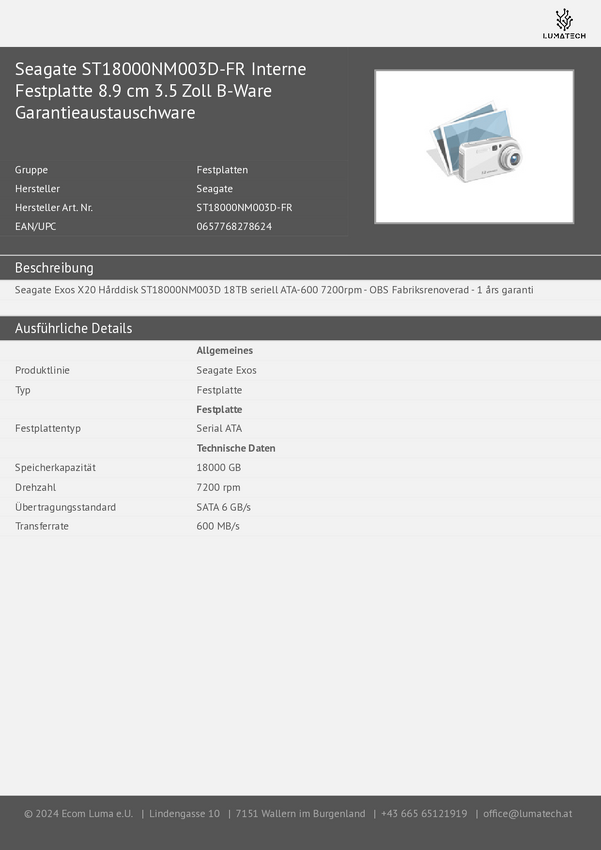 Seagate ST18000NM003D-FR Dysk twardy wewnętrzny, 3,5'' (8,9 cm) Refurbished (bardzo dobry) 18 TB Exos X20 SATA 6 Gb/s