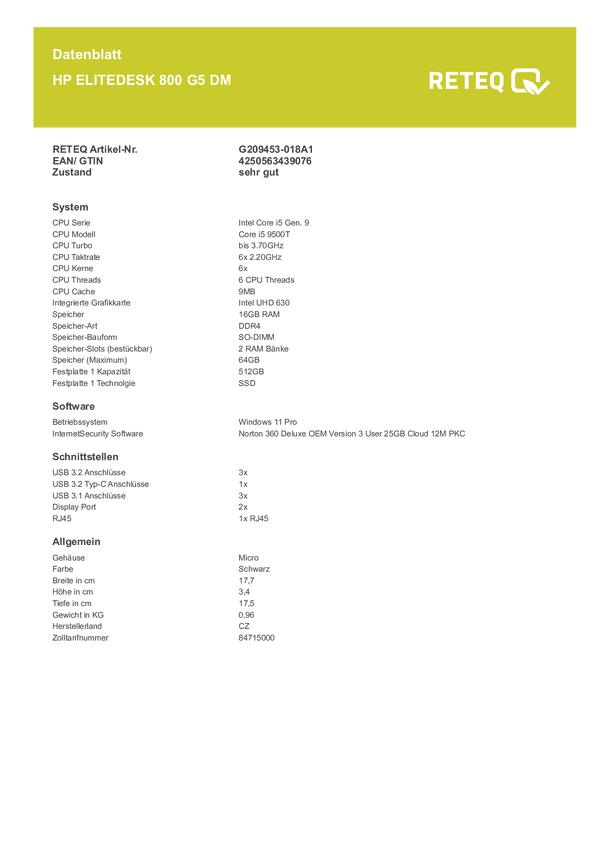 HP Komputer PC stacjonarny Refurbished (bardzo dobry) Intel® Core™ 5 Core i5 9500T 16 GB 512 GB Intel UHD Graphics Windo