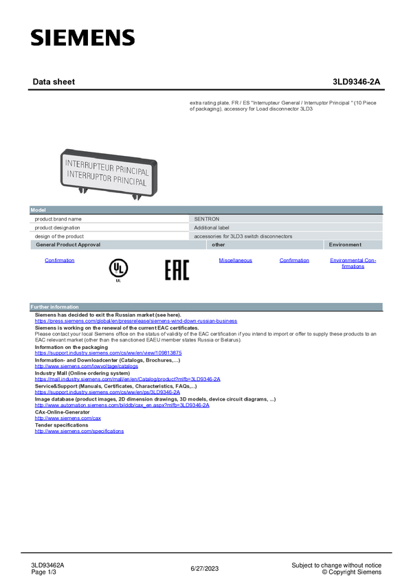 Siemens 3LD9346-3A Tabliczka dodatkowa 10 szt.