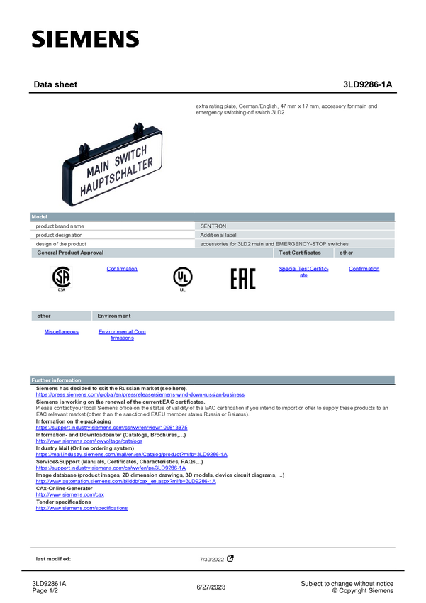 Siemens 3LD92861A Tabliczka dodatkowa 3LD9286-1A