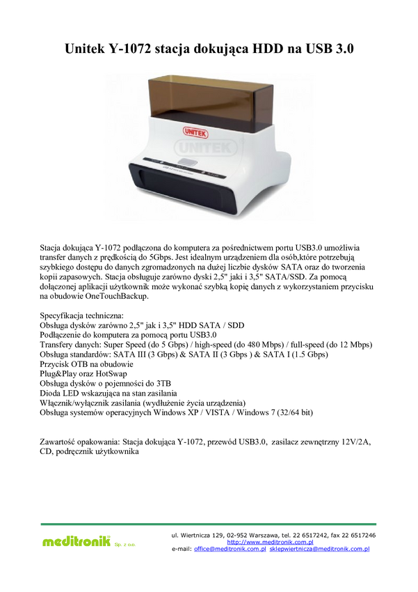 Unitek Y-1072 stacja dokująca USB 3.0 na dyski SATA