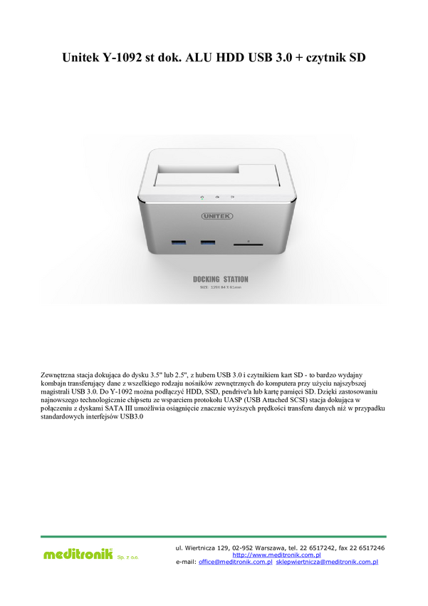 Unitek Y-1092 stacja dokująca alu HDD USB 3.0 + czytnik SD