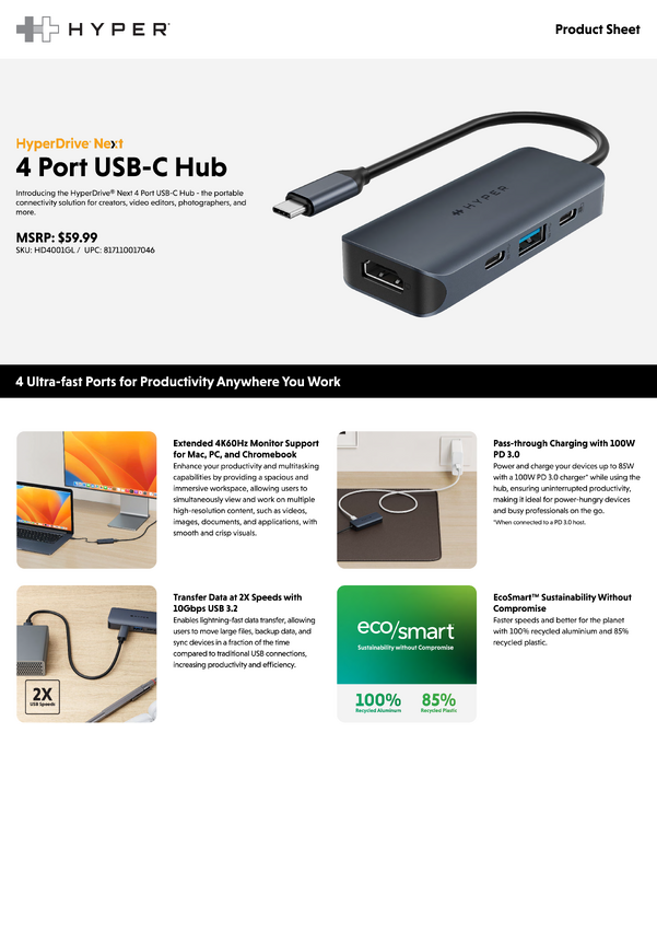 Stacja dokująca USB-C® HYPER HyperDrive EcoSmart Gen.2 Hub zasilanie USB-C®
