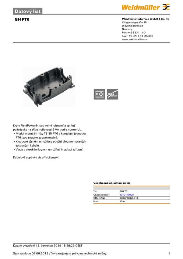 Dolna część obudowy Weidmüller GH PT6 1070140000 10 szt.