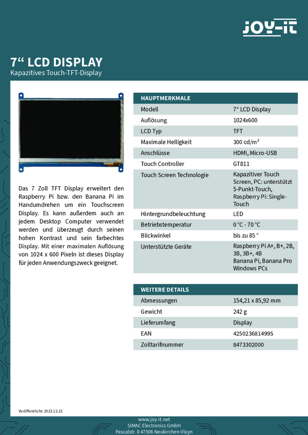 Moduł ekranu dotykowego Joy-it RB-LCD-7-2 17.8 cm (7 cal) 1024 x 600 Pixel Pasuje do: Raspberry Pi®