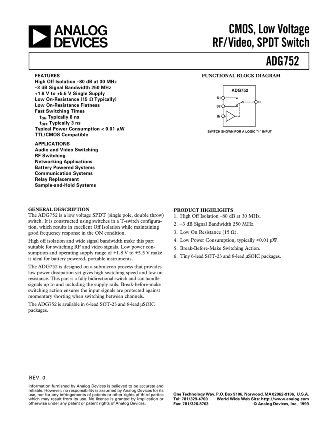 ADG752: CMOS, Low Voltage, RF/ Video, SPDT Switch (Single Pole, Double Throw)