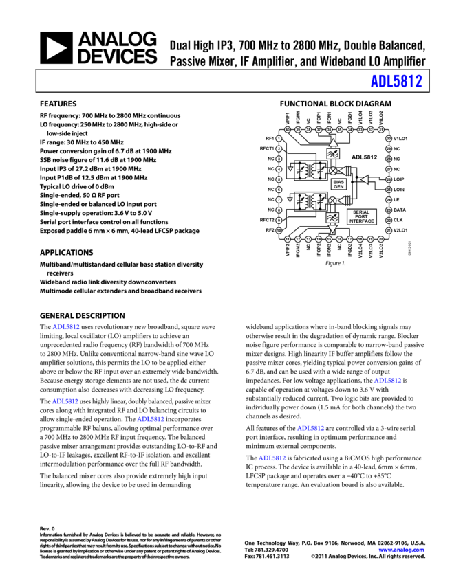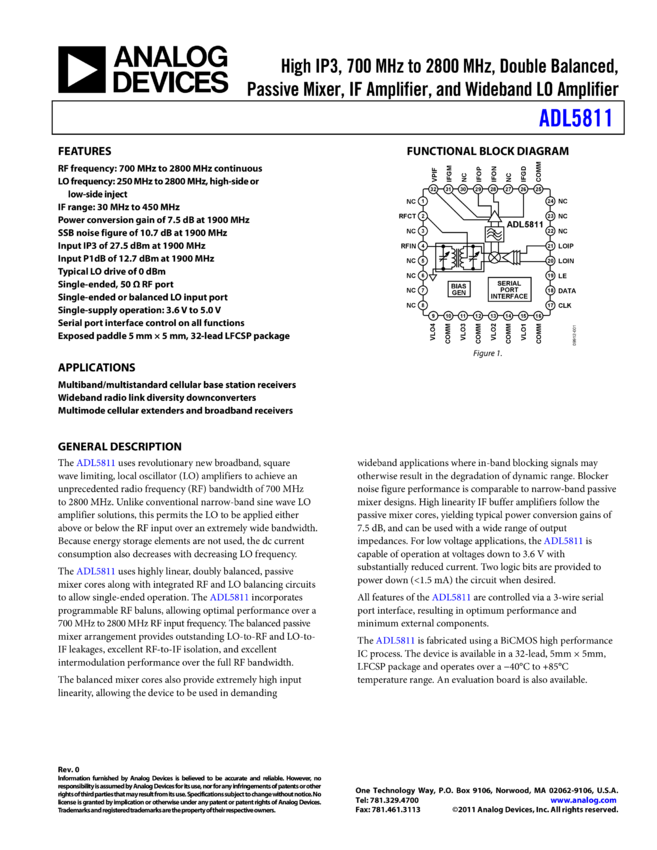 ADL5811: High IP3, 700 , Double Balanced, Passive Mixer, IF Amp, and Wideband LO Amp