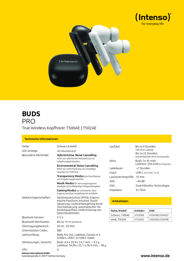 Słuchawki douszne Intenso Buds Pro T500HAE schwarz 3720500 czarny