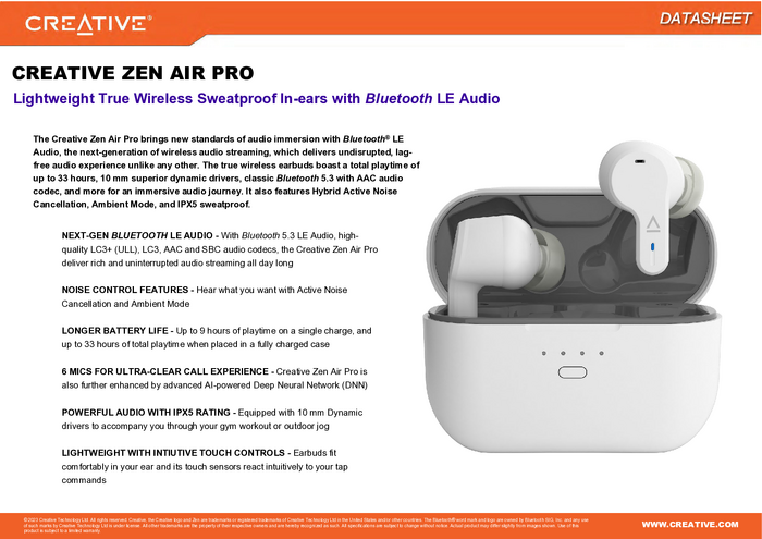Creative Zen Air Pro Słuchawki douszne Bluetooth biały odporne na pot, odporne na wodę, Wskaźnik naładowania akumulatora