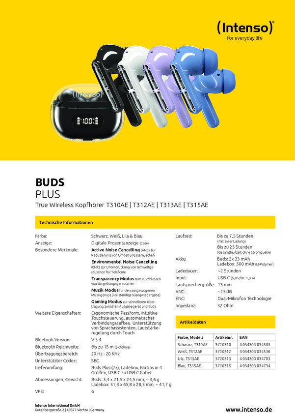 Intenso Buds Plus T313AE lila Słuchawki douszne Bluetooth stereo liliowy Wyciszanie hałasów Telefon komórkowy