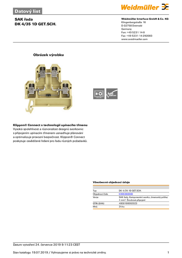 Seria SAK, Podzespół listwy rzędowej, Przekrój pomiarowy: 4 mm², złącze śrubowe, DK 4/35 1D GET.SCH. 0396360000 beżowy,