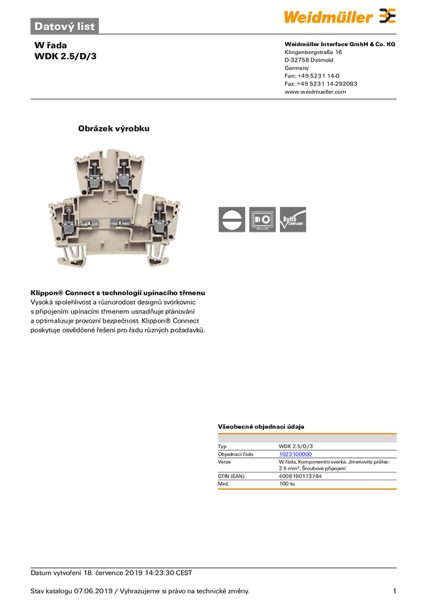 Seria W, Podzespół listwy rzędowej, Przekrój pomiarowy: 2.5 mm², złącze śrubowe, montaż bezpośredni WDK 2.5/D/3 10231000