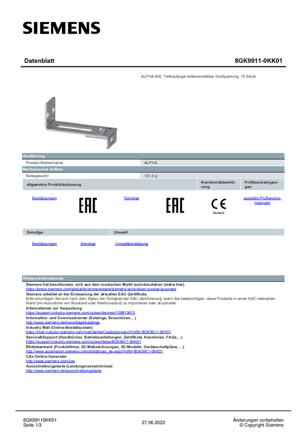 Wspornik inżynierii lądowej i wodnej Siemens 8GK9911-0KK01 10 szt.