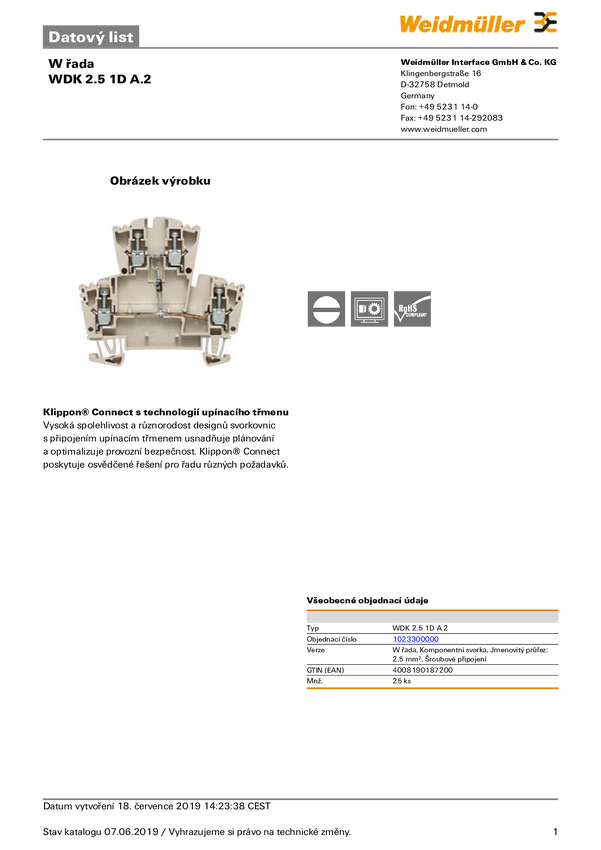 Seria W, Podzespół listwy rzędowej, Przekrój pomiarowy: 2.5 mm², złącze śrubowe, montaż bezpośredni WDK 2.5 1D A.2 10233