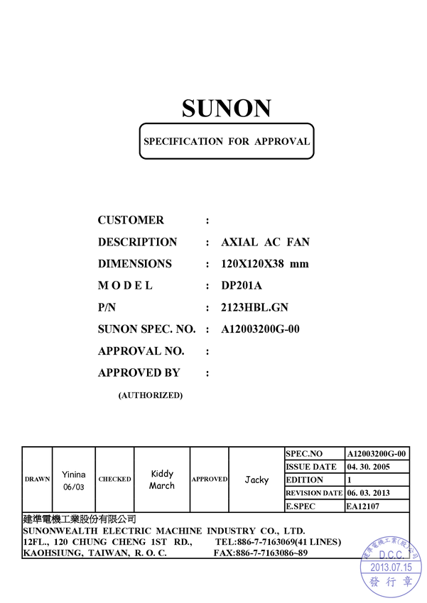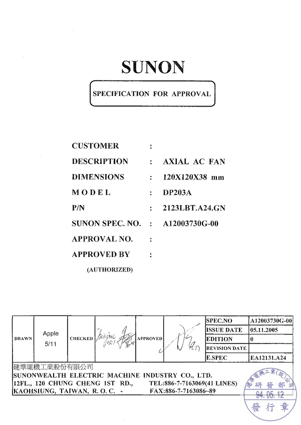 Wentylator 230V 120x38 KU S 165m3/h wtyczka; łożysko kulkowe 45dBA; I=0,14A; P-22W; 2850 obr/min podobny wentylator to A2123-HBT, kabelek z wtyczką LFTK01 sprzedawany oddzielnie Nadruk DP200A 2123XBT.GN DP200A 2123XBT.GN 220-240V - 50/60hz 0,14/0,12AMP Impedance protected