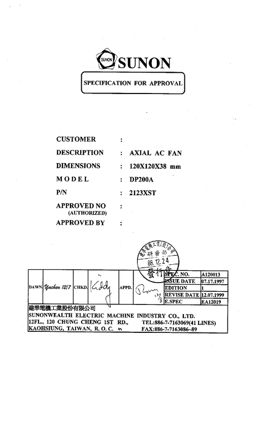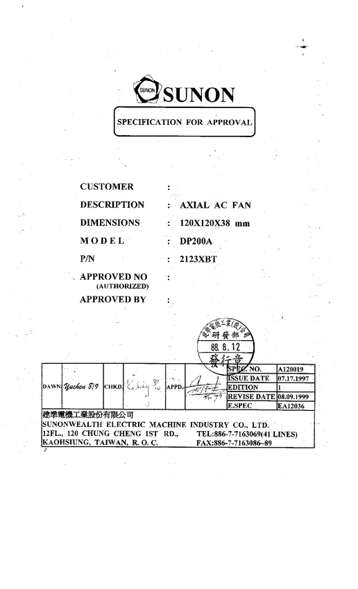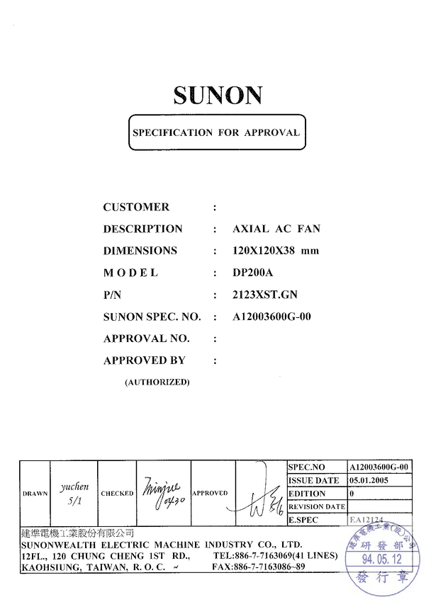 Wentylator 230V 120x38 KU S 165m3/h wtyczka; łożysko kulkowe 45dBA; I=0,14A; P-22W; 2850 obr/min podobny wentylator to A2123-HBT, kabelek z wtyczką LFTK01 sprzedawany oddzielnie Nadruk DP200A 2123XBT.GN DP200A 2123XBT.GN 220-240V - 50/60hz 0,14/0,12AMP Impedance protected