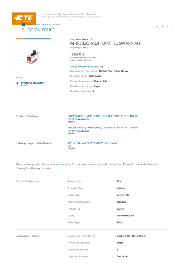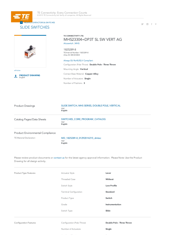 Switch Slide DP3T Top Slide 0.25A 125VAC 12VDC 10000Cycle PC Pins Thru-Hole