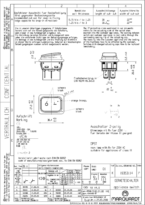 Przełącznik; 1939.3314; (ON)-OFF-(ON); czarny; 12A/250V; IP65 od czoła; 30,2x22mm; konektor 6,3mm; 2 tory; DP3T; MARQUARDT; RoHS