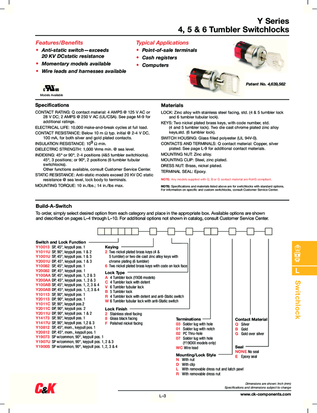 Switch Key Lock DP3T 45° Flat Key 4A 250VAC 28VDC Solder Lug Panel Mount