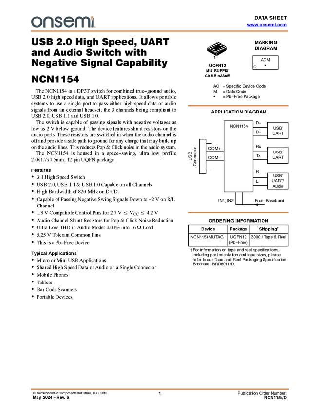 DP3T Data Switch, USB 2.0 High Speed / Audio, with Negative Swing Capability