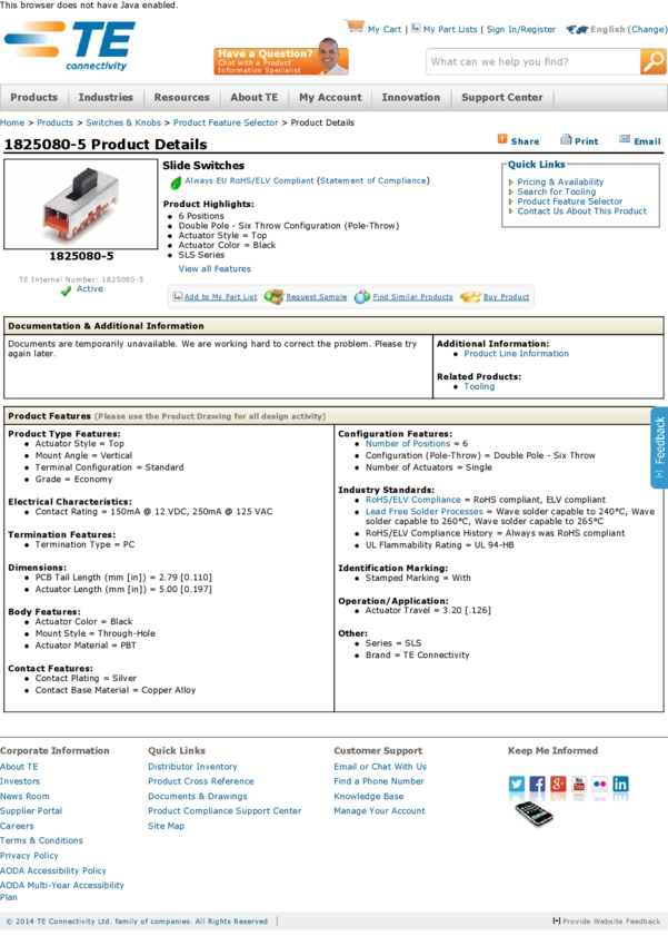 Switch Slide DP6T Top Slide 0.25A 125VAC 12VDC 10000Cycle PC Pins Thru-Hole