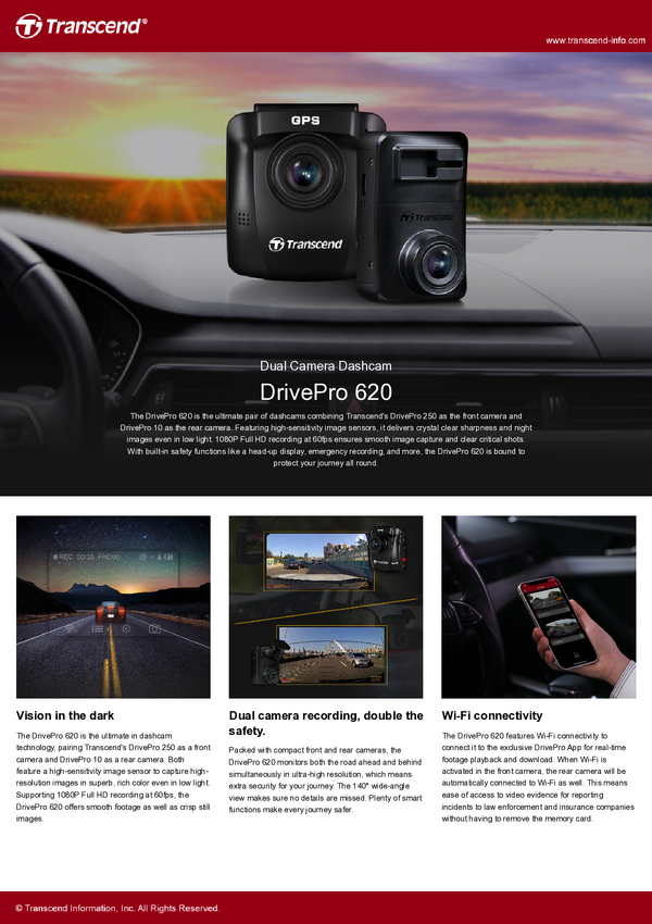 Transcend DrivePro 620 Kamera samochodowa Kąt widzenia w poziomie=140 ° akumulator, wyświetlacz, kamera podwójna, kamera