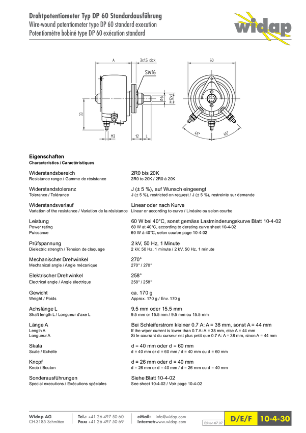 Potencjometr drutowy Firmy Widap liniowy 60W tolerancja +-5% kąt obroty 270 stopni, złącza śrubowe M3; ośka 6,00mmx15,5mm średnica 50mm; głębokość 38..44mm; gwint M12; kąt elektryczny 258 stopni; kąt mechaniczny 270 stopni Rezystancja 500 ohm J (+-5%) Prąd I=0,35A