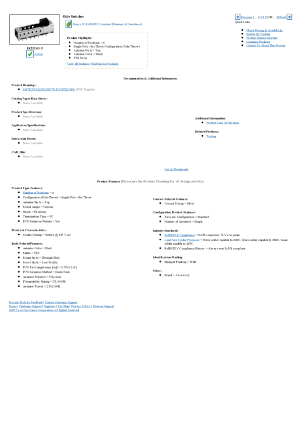 Switch Slide DP6T Top Slide 0.25A 125VAC PC Pins Thru-Hole Bulk