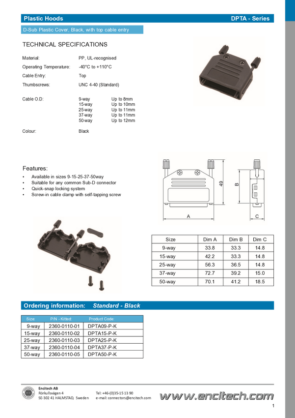 encitech 2360-0110-05 Obudowa złącza D-SUB DPPK50-CC-BK-K, PP (polipropylen), 180 °, 1 szt.