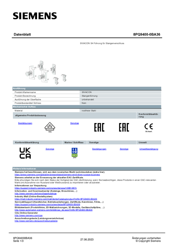 Prowadnica blokady drążka Siemens 8PQ9400-0BA36 1 szt.