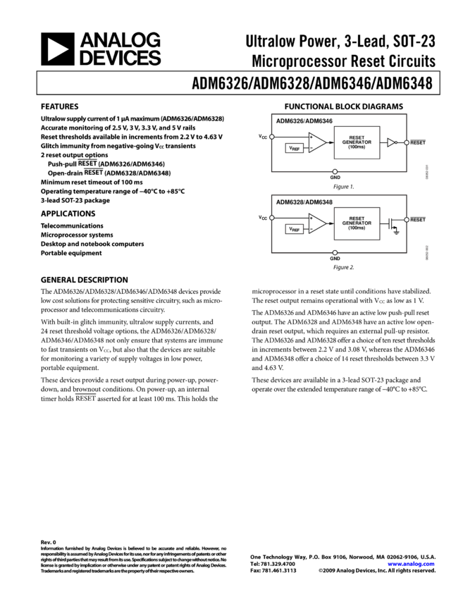 ADM6348: Ultralow Power, 3-Lead, SOT-23, Microprocessor Reset Circuit, Active-Low Open-Drain Output, 1 μA Supply Current