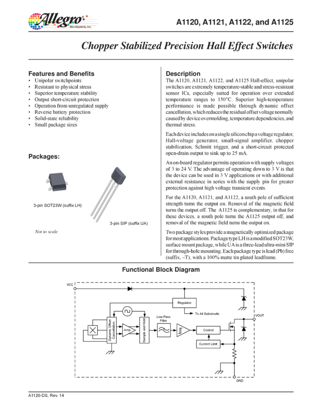 Czujnik Halla w postaci układu scalonego, zatrzaskowy, Bop 5 / 40 G, Brp -40 / -5 G, Bhys 45 G, wyjście typu otwarty dren, zakres temperaturowy: L
