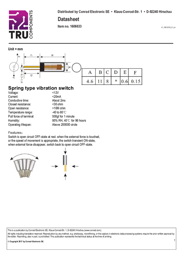 TRU COMPONENTS TC-SW-18015P Czujnik drgań Zakres pomiarowy: 360 ° (max) piny lutownicze