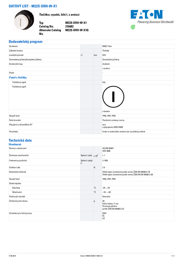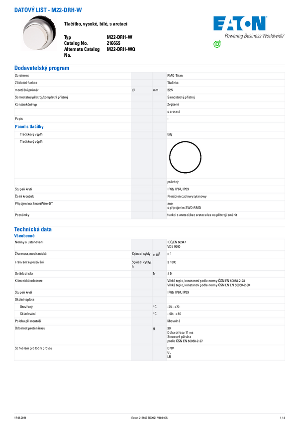 Eaton 216665 M22-DRH-W Przycisk pierścień przedni z tworzywa sztucznego 1 szt.