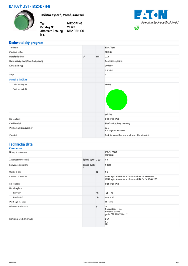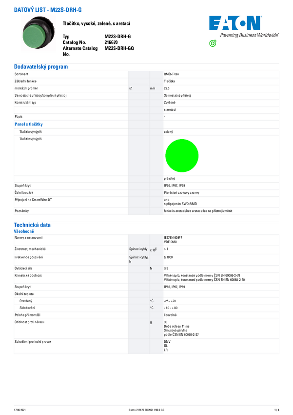 Eaton 216669 M22-DRH-G Przycisk pierścień przedni z tworzywa sztucznego 1 szt.