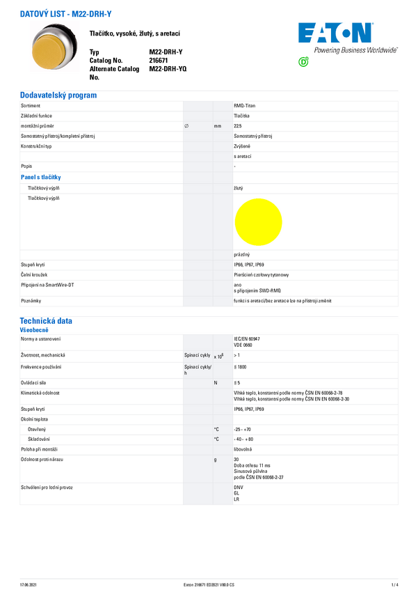 Eaton 216671 M22-DRH-Y Przycisk pierścień przedni z tworzywa sztucznego 1 szt.