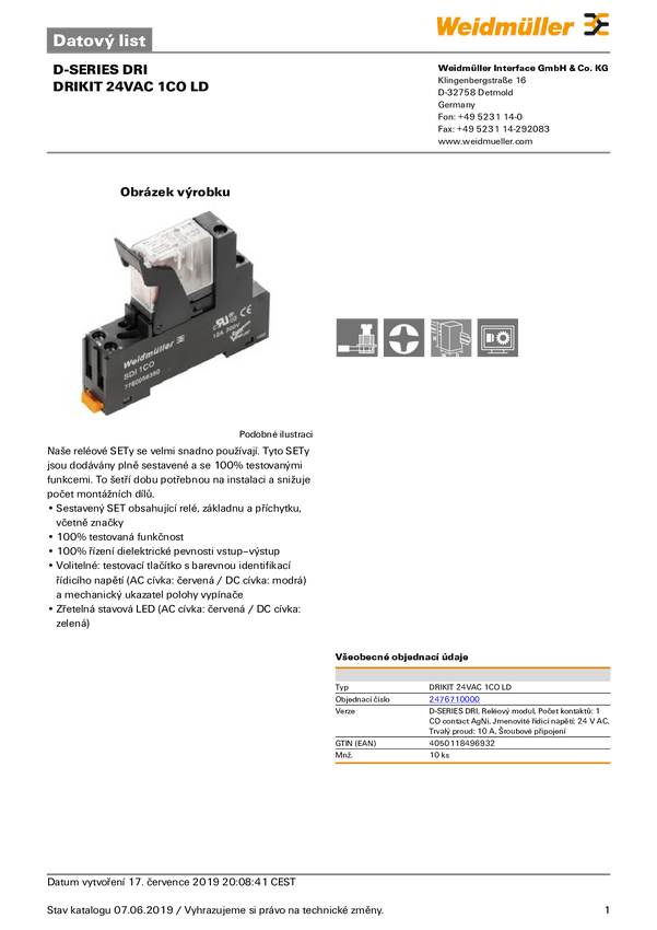 Moduł przekaźnikowy Weidmüller DRIKITP 24VDC 1CO LD/PB 24 V/DC 10 A 1 zestyk przełączny 10 szt.