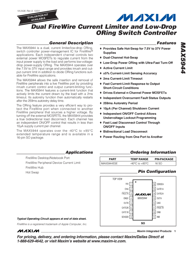MAX5944 Dual FireWire Current Limiter and Low-Drop ORing Switch Controller