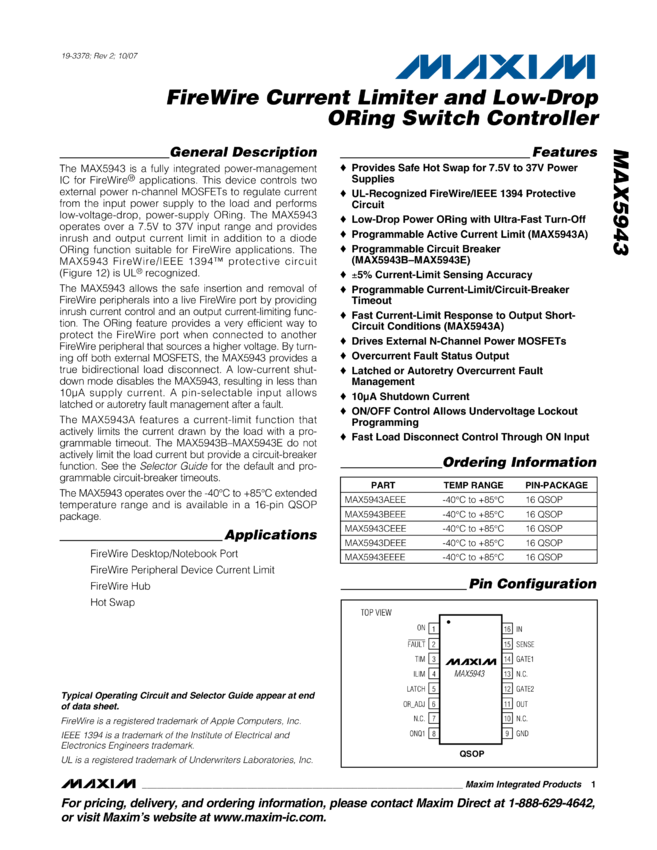 MAX5943 FireWire Current Limiter and Low-Drop ORing Switch Controller