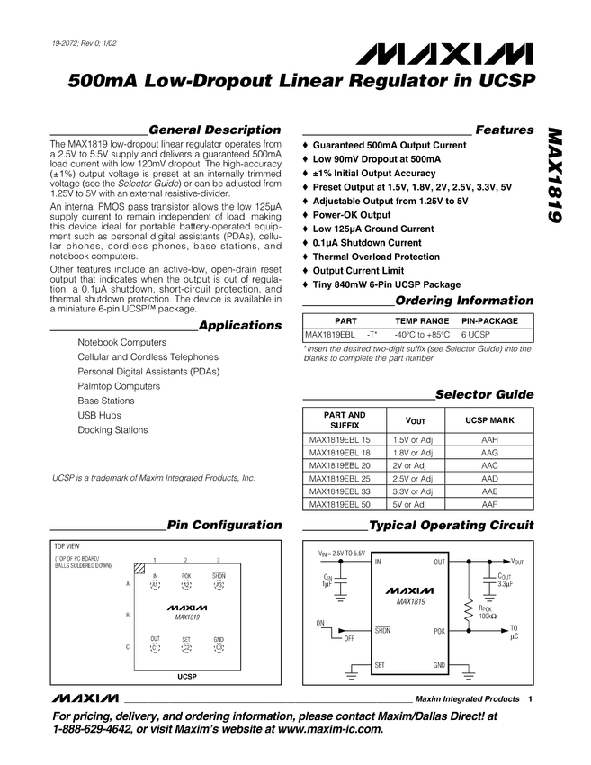 MAX1819 500mA Low-Dropout Linear Regulator in UCSP