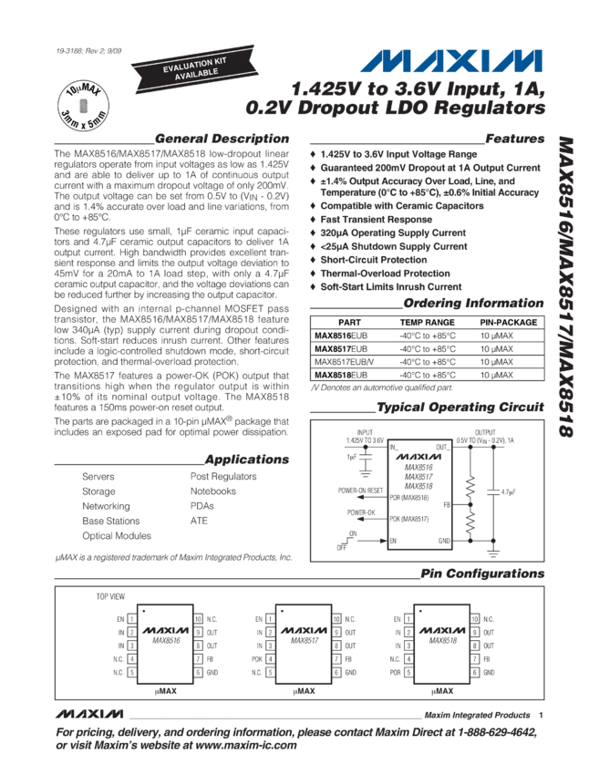 MAX8516, MAX8517, MAX8518 1.425V to 3.6V Input, 1A, 0.2V Dropout LDO Regulators