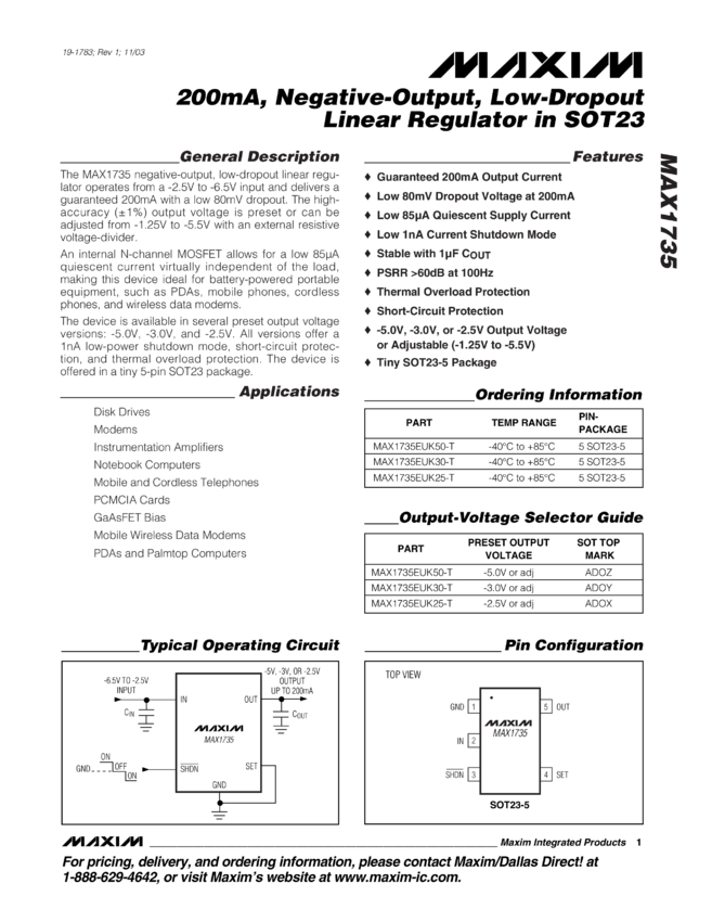 MAX1735 200mA, Negative-Output, Low-Dropout Linear Regulator in SOT23