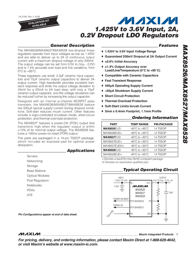 MAX8526, MAX8527, MAX8528 1.425V to 3.6V Input, 2A, 0.2V Dropout LDO Regulators