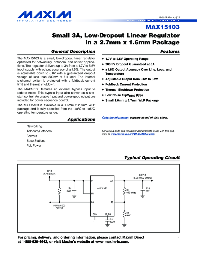 MAX15103 Small 3A, Low-Dropout Linear Regulator in a 2.7mm x 1.6mm Package