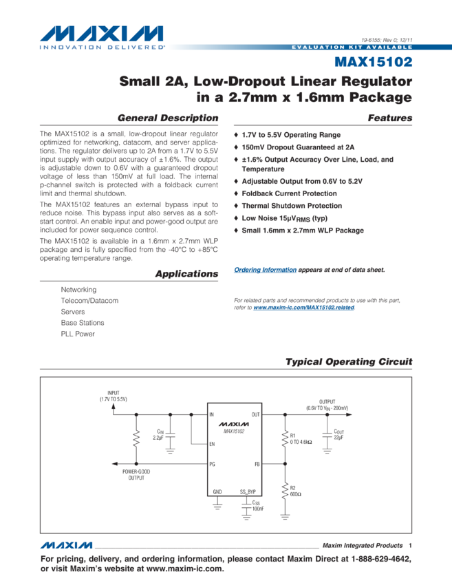 MAX15102 Small 2A, Low-Dropout Linear Regulator in a 2.7mm × 1.6mm Package