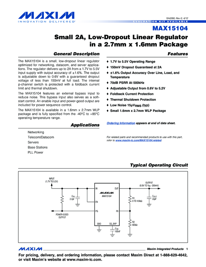 MAX15104 Small 2A, Low-Dropout Linear Regulator in a 2.7mm × 1.6mm Package