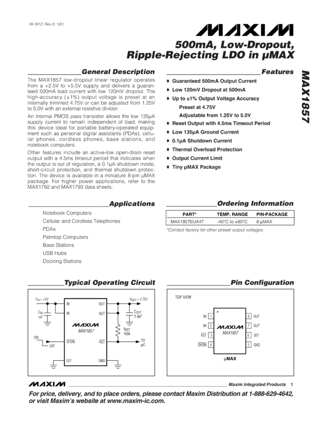 MAX1857 500mA, Low-Dropout, Ripple-Rejecting LDO in µMAX