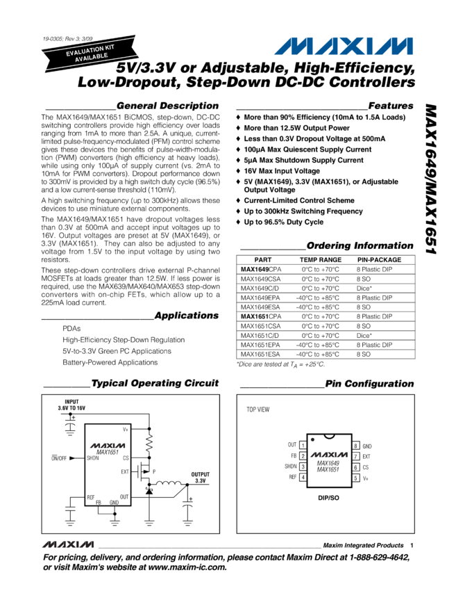 MAX1649, MAX1651 5V/3.3V or Adjustable, High-Efficiency, Low-Dropout, Step-Down DC-DC Controller